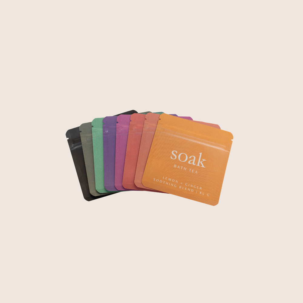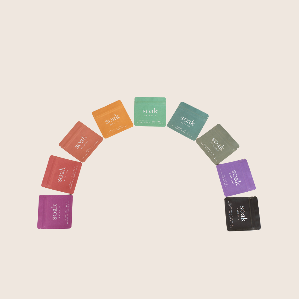 This pack is divided out by scent so if you’re looking to add to a gift box or themed retail section you can choose one or all of our colors and best selling scents. The salts are in our new pre-printed compostable and biodegradable bags printed with soy based inks.