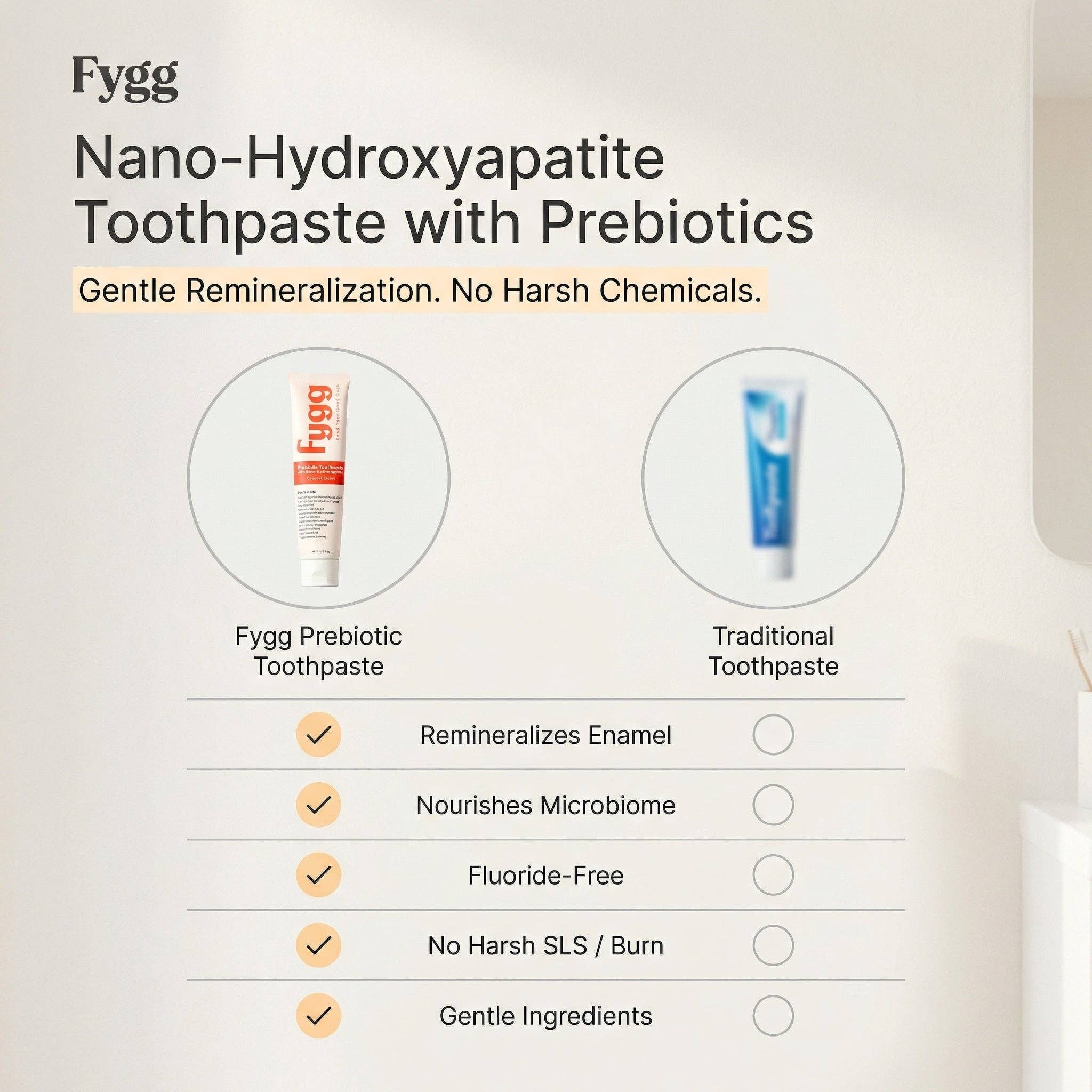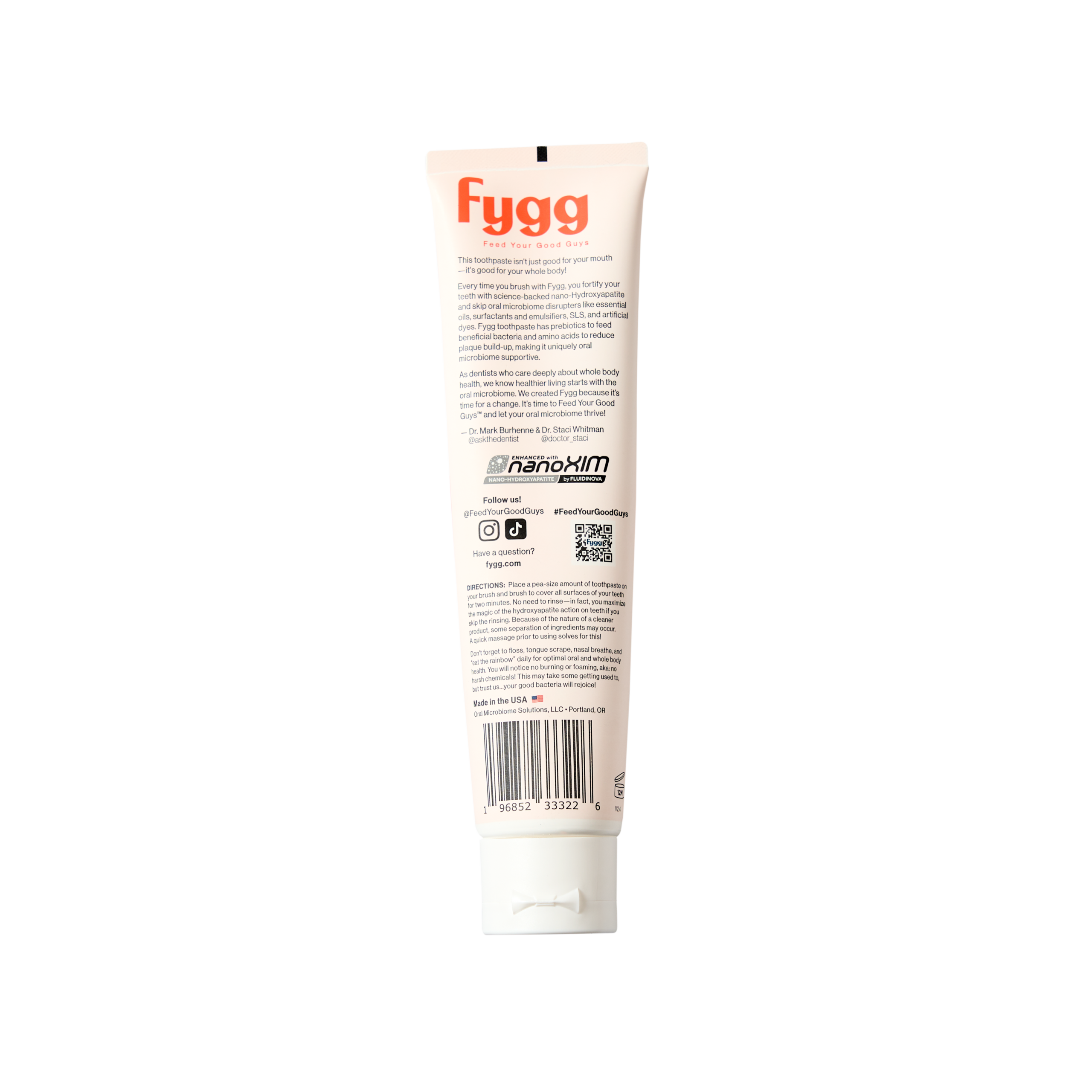 Fygg’s prebiotic nano-Hydroxyapatite toothpaste is formulated with biomimetic and oral microbiome nourishing ingredients for a healthier smile and a healthier you.