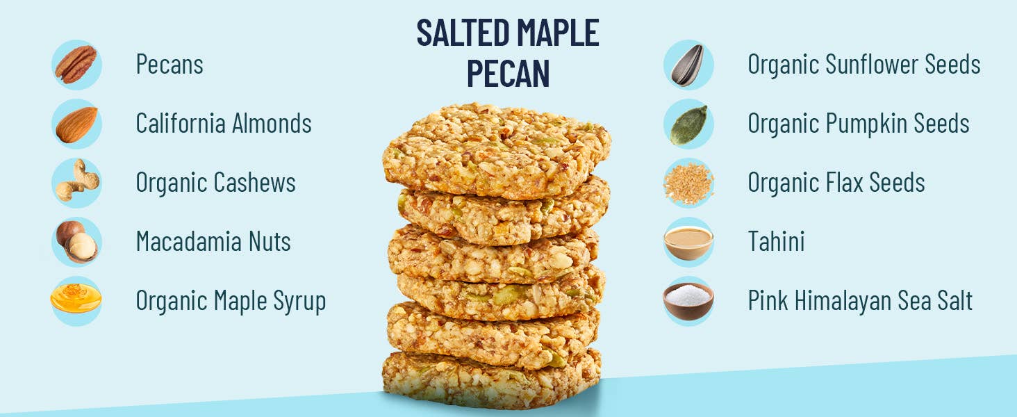 Our tried and true blend of buttery Texas pecans, creamy macadamias, almonds, and cashews, kissed with rich Grade B Vermont maple syrup, golden flax, and mineral-rich French sea salt. Crunchy, chewy, nutty, and deeply satisfying, this bar delivers plant-based goodness with a perfect balance of sweet and salty.