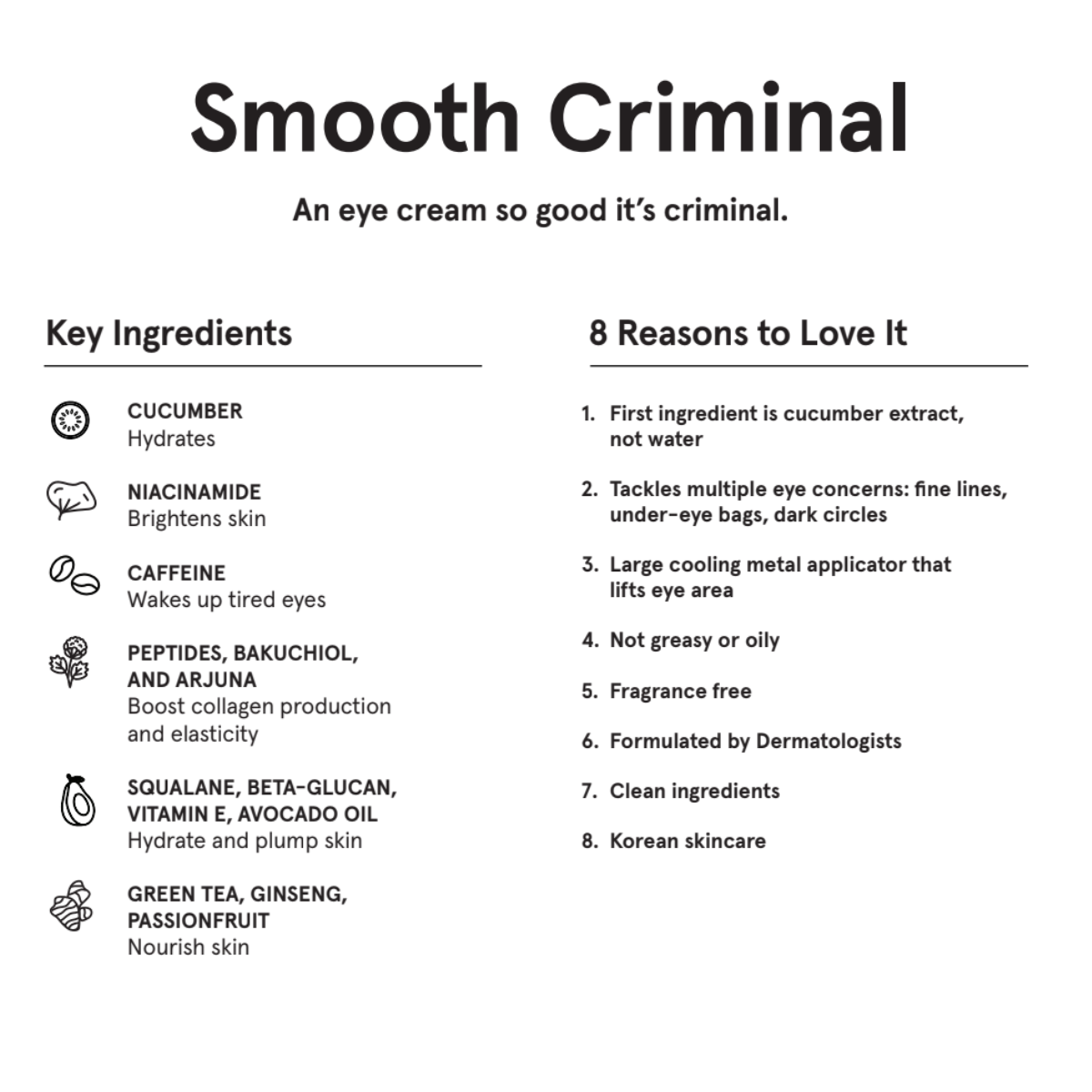With a potent blend of age-defying antioxidants and K-beauty botanicals, firming eye cream Smooth Criminal works tirelessly to kick fine lines, under-eye bags, and dark circles to the curb. We also added an oversized eye puffiness reducer metal applicator that acts as a cooling and lifting tool to erase the evidence of long days and late nights. With this instant eye brightener, you’ll be looking like a million bucks in no time.