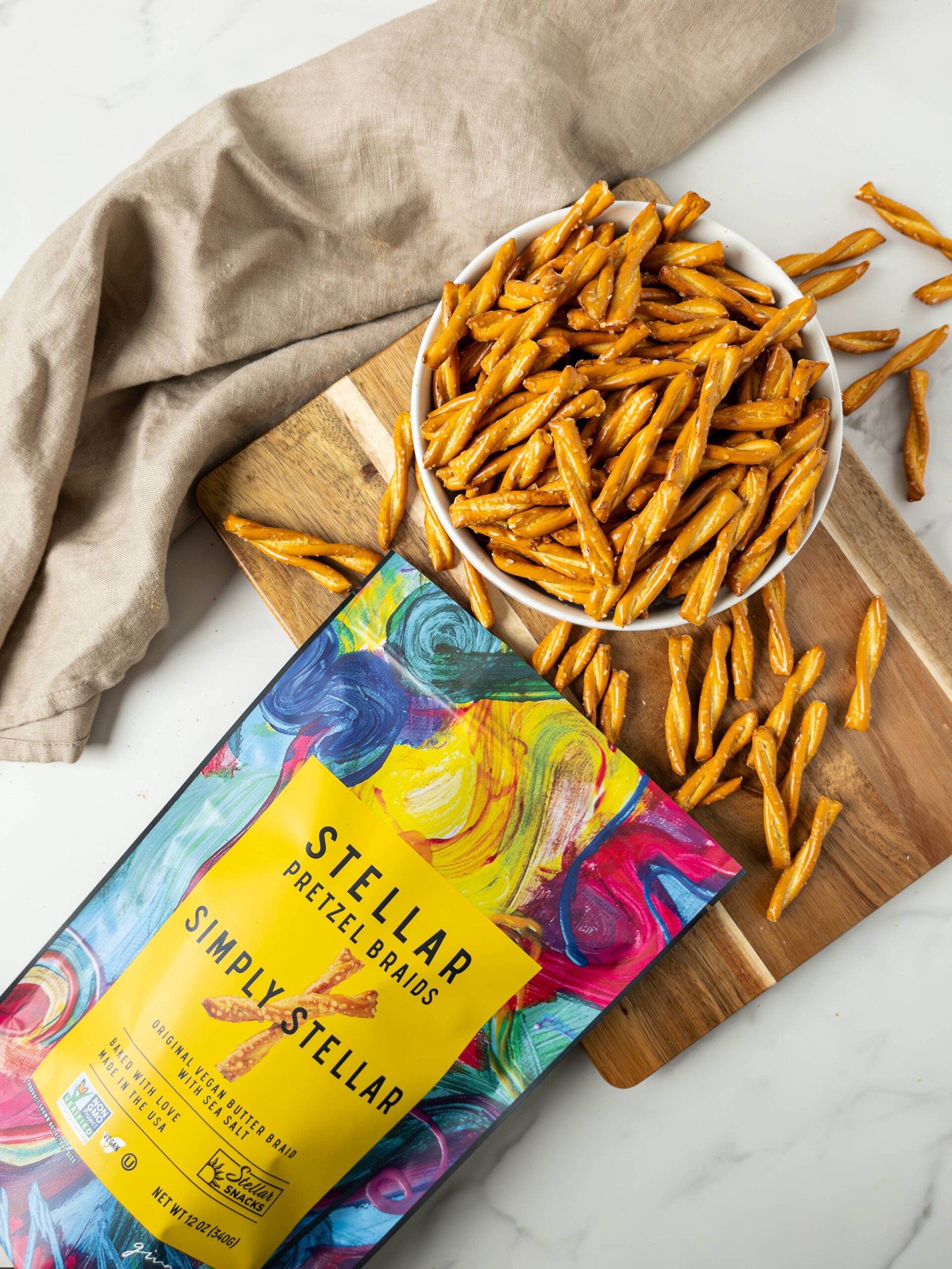 A classic pretzel with a wholesome twist! Simply Stellar pretzel braids are infused with naturally rich vegan butter and sprinkled with the perfect pinch of sea salt. Delicious on their own or paired with your favorite dip, these vegan pretzels are a canvas for flavor.