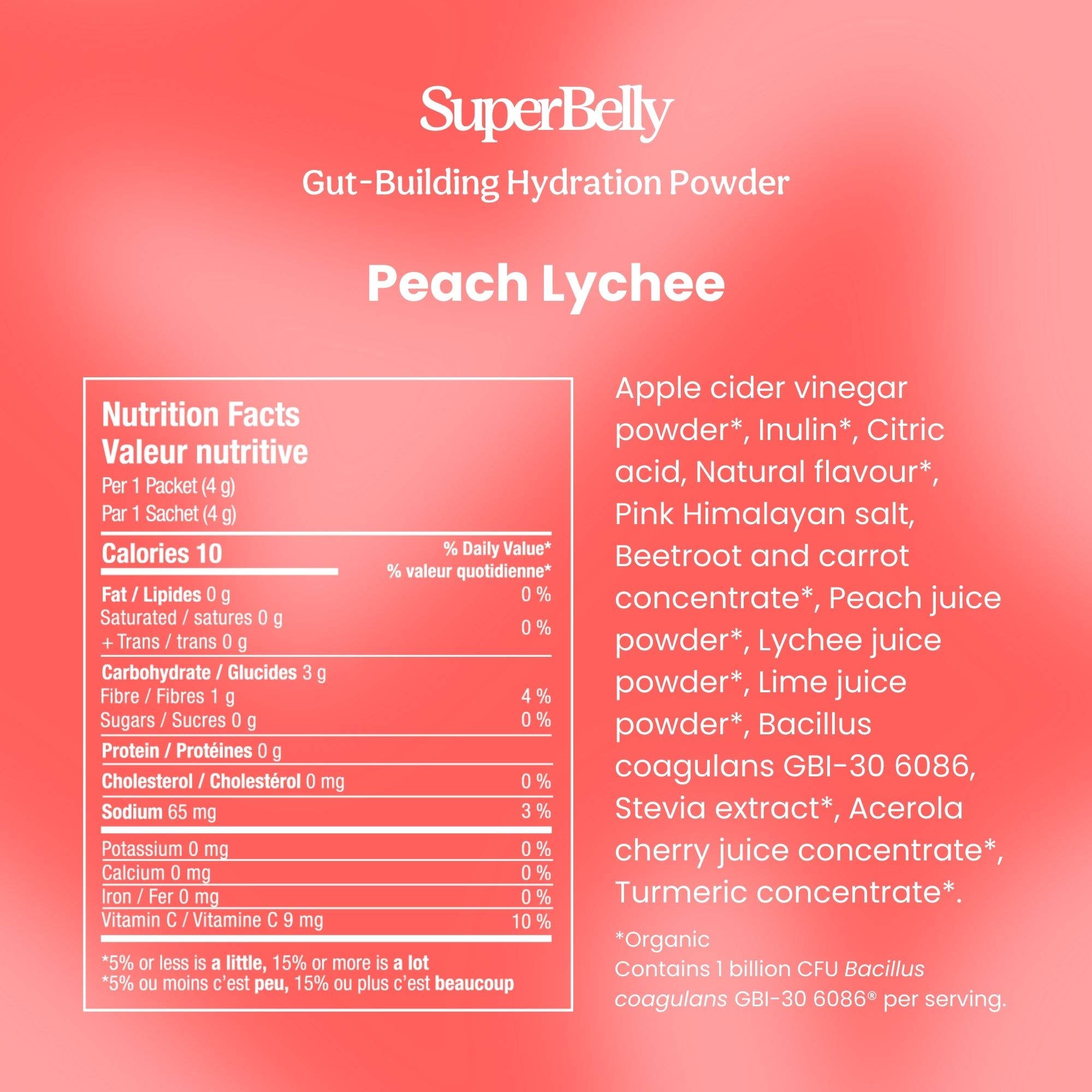 A refreshing blend of juicy peach and delicate lychee, this light and crisp flavour delivers functional hydration with a subtle hint of nostalgia. Designed for daily wellness routines, SuperBelly combines electrolytes, fibre, apple cider vinegar, and clinically studied BC30 probiotics to support gut health while keeping customers hydrated.